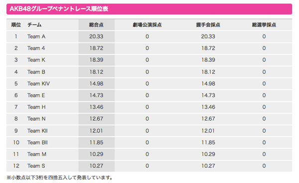 「AKB48グループペナントレース~AKB48グループは競い合って磨かれる~」の順位表が27日に更新され、26、27日の両日に行われた握手会の点数が反映された。26、27日はAKB48の34thシングル「鈴懸の木の道で『君の微笑みを夢に見る』と言ってしまったら僕たちの関係はどう変わってしまうのか、僕な りに何日か考えた上でのやや気恥ずかしい結論のようなもの」劇場盤発売記念大握手会が行われ、2日間の個別握手券販売枚数による勝ち点が各チームに割り振 られた。