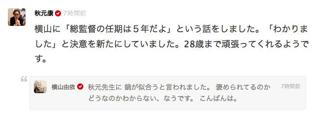 横山に「総監督の任期は5年だよ」という話をしました。