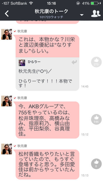 【トークライブアプリ755】公式参加メンバー「秋元康、多田、横山、松井珠、高橋み、指原、平田、谷、北原、高柳」。ぱるるはやってません(9/5 16時現在) 2014年09月05日 カテゴリ:トークライブアプリ755秋元康 mixiチェック 【【トークライブアプリ755】公式参加メンバー「秋元康、多田、横山、松井珠、高橋み、指原、平田、谷、北原、高柳」。ぱるるはやってません(9/5 16時現在)】の続きを読む タグ :#トークライブアプリ755#秋元康.AKB